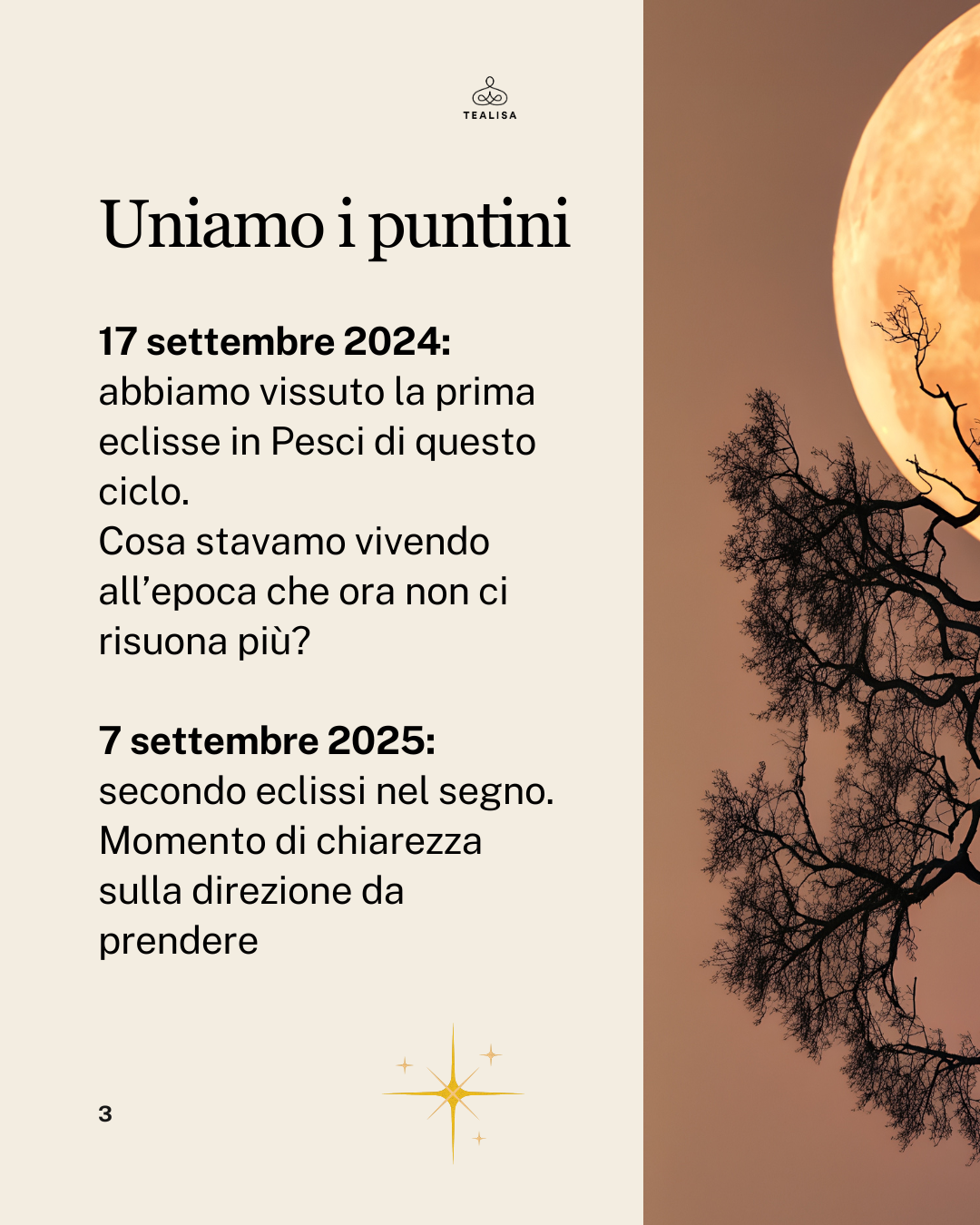 Sotto questa Luna Nuova, potrebbe esserci una naturale spinta ad unire i puntini e riflettere su quanto accaduto nella date delle Eclissi in Pesci precedenti (vedi sopra) e su tutto ciò che hanno fatto emergere. Quali schemi si sono ripetuti? Quali emozioni o esperienze sembrano ancora irrisolte? L'energia dei Pesci può aiutarci a portare compassione e accettazione in queste aree, permettendoci finalmente di lasciarle andare.